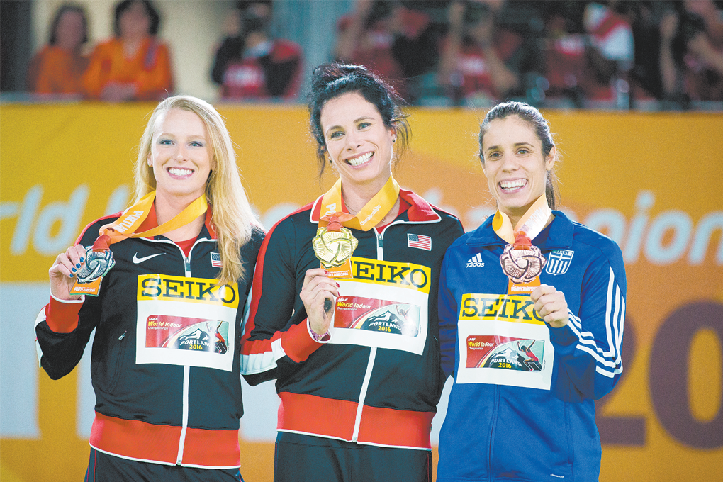 Greenville pole vaulter Sandi Morris poses for the cameras and displays the silver medal she won at the at the 2016 IAFF World Indoor Championships in Portland, Ore. Morris cleared a height of 15 feet, 11 inches for the second-place finish. [CREDIT: Wilder]
